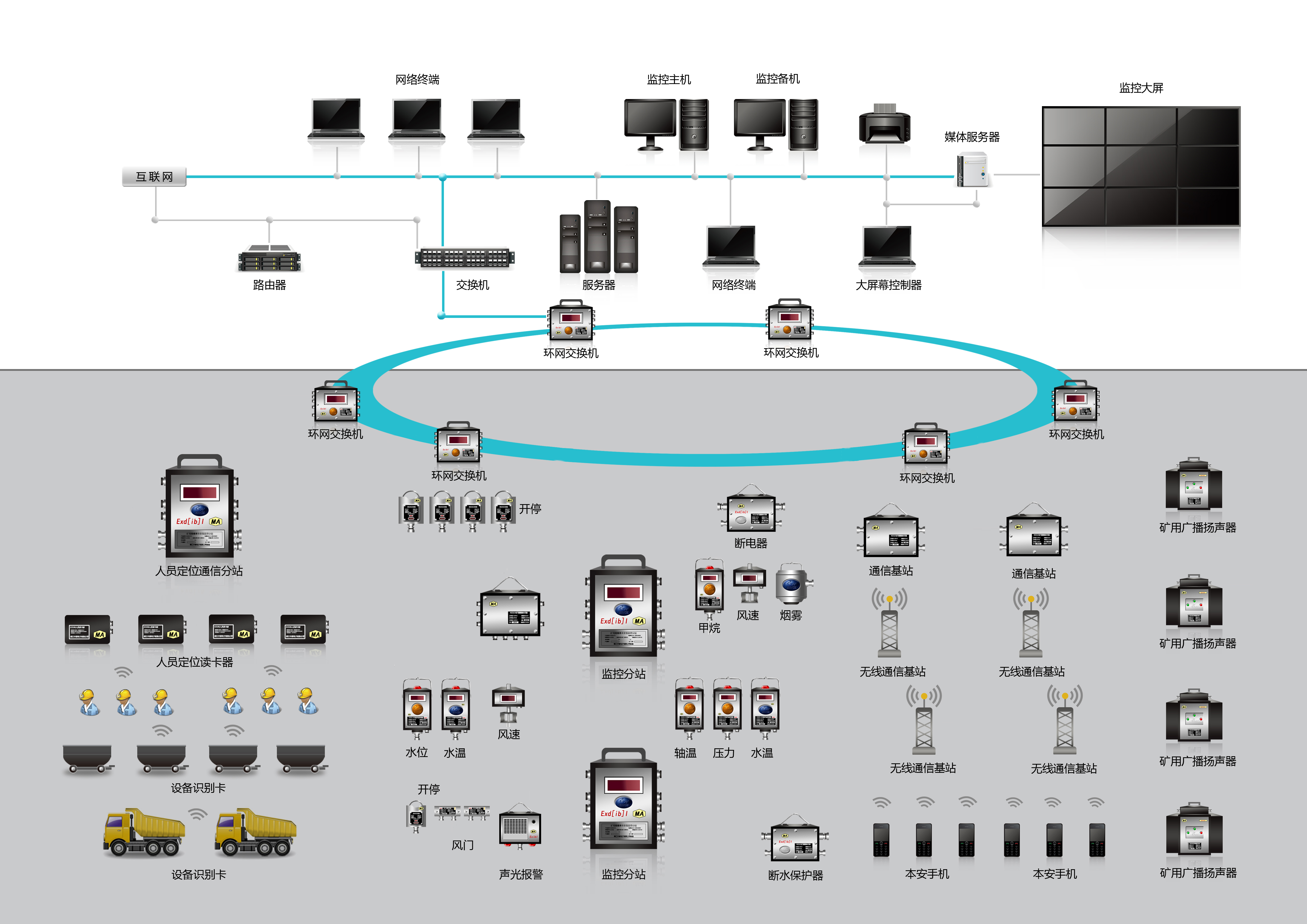 全系列傳感器顯示數據和監控中心站收到數據實(shí)現零誤差傳輸,該標準高于國家要求的允許傳輸處理誤差0.5%。增加了KJJ18礦用本安型以太環(huán)網(wǎng)交換機作為主干網(wǎng)傳輸設備。